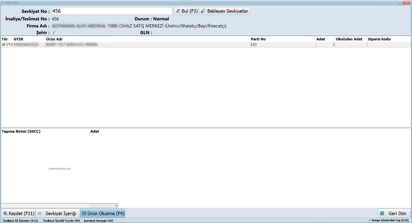 - Ekranın alt kısmındaki Taşıma Birimi (SSCC) alanı, sevkiyatta kullanılan kutu veya palet numarasını ifade eder.