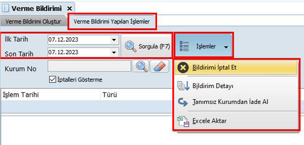 - Bildirim Yapma: Verme bildirimi yapılır.