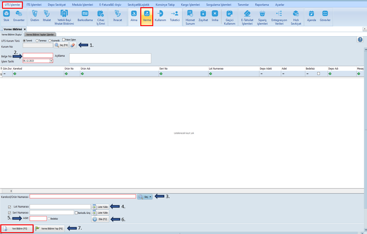 Verme Bildirimi: Bir firma sahip olduğu tekil ürünleri başka bir kurum, firma veya hastaneye verdiğinde Verme Bildirimi yapar.