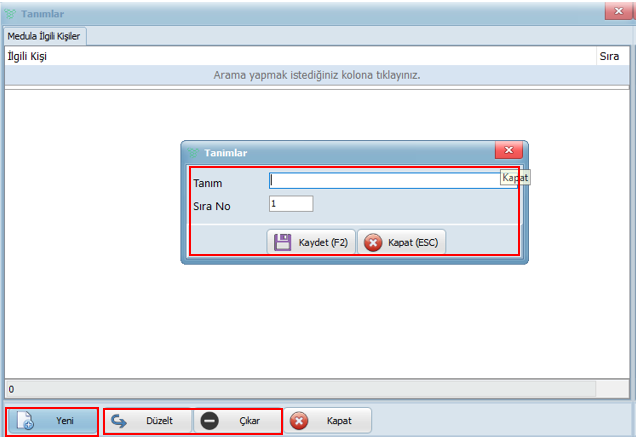 Tanımlar menüsünden 'İlgili Kişiler' seçeneği açılır. Karşımıza Medula İlgili Kişiler ekranı gelir. 'Yeni' butonuna tıklanarak yeni bir kişi oluşturulabilir. 'Tanım' kısmına tanım, 'Sıra No' kısmına sıra numarası yazılır ve son olarak 'Kaydet' butonuna basılır.