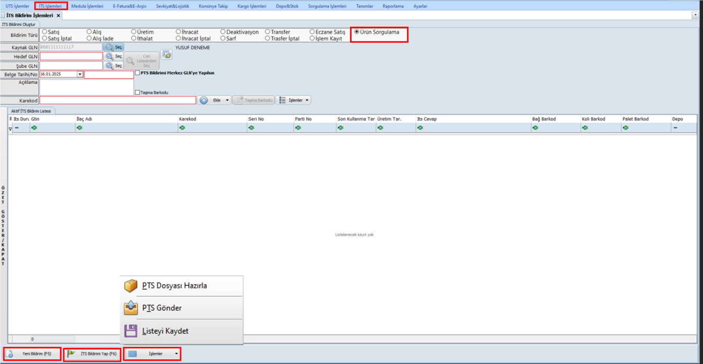 Hedef GLN Seçilir: Ürün sorgulama işlemi yapılacak depo, eczane veya kurumun GLN numarası, "Hedef GLN" alanına girilir.