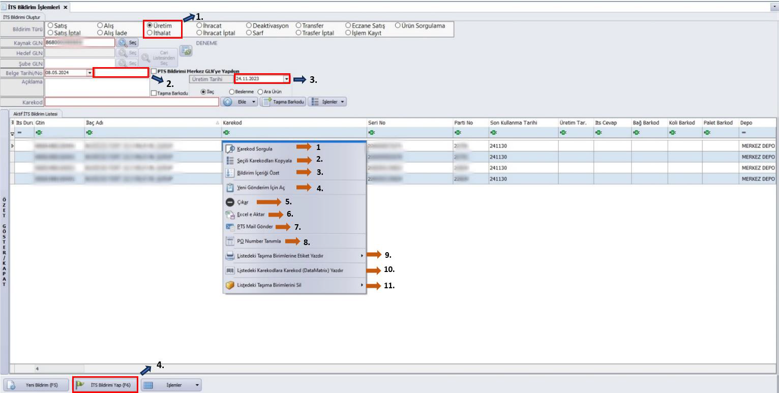 İTS Serbest Ekranında: Herhangi bir bildirimde, listeye sağ tık yapıldığında işlem yapılabilir.