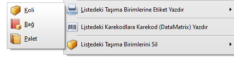 Listedeki Taşıma Birimlerine Etiket Yazdır: Listedeki taşıma birimine etiket almak için (koli-bağ-palet) etiket yazdırılır.