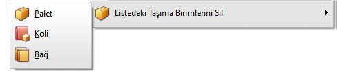 Listedeki Taşıma Birimlerini Sil: Listedeki taşıma etiketlerini (Koli, Bağ, Palet) toplu olarak silmek için işlem yapılır.