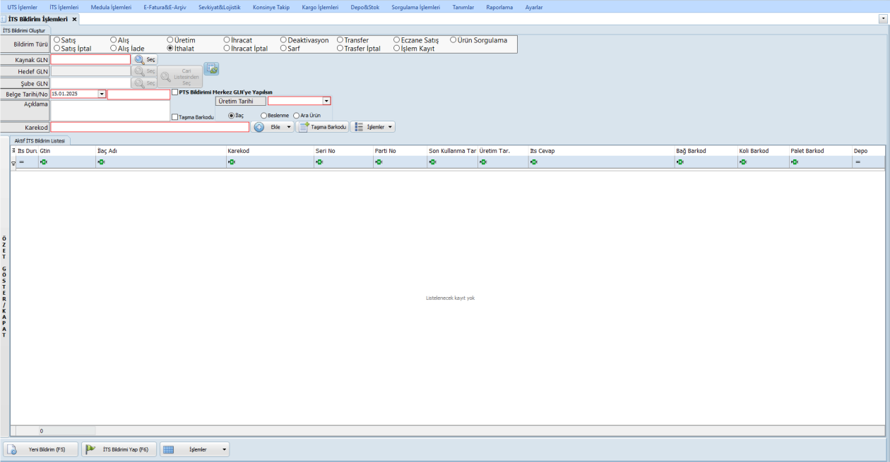 İTS İşlemleri Menüsünden Serbest İTS Bildirimleri Seçilir: Karekodlar listeye alındıktan sonra, Bildirim kısmından İthalat seçeneği seçilir.