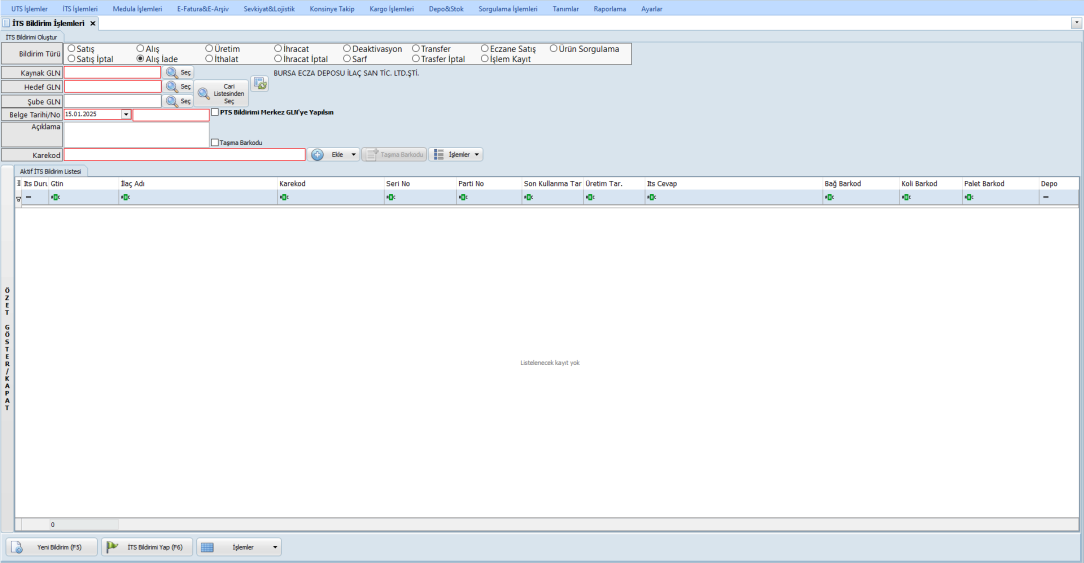 Alış iade bildirimi, firmanın iade ettiği ürünlerin İlaç Takip Sistemi'ne (İTS) doğru şekilde kaydedilmesini sağlar. Bu işlem, iade edilen ürünlerin izlenebilirliğini ve takibini temin ederek, yasal gerekliliklerin yerine getirilmesine ve stok bilgilerinin güncel tutulmasına yardımcı olur.