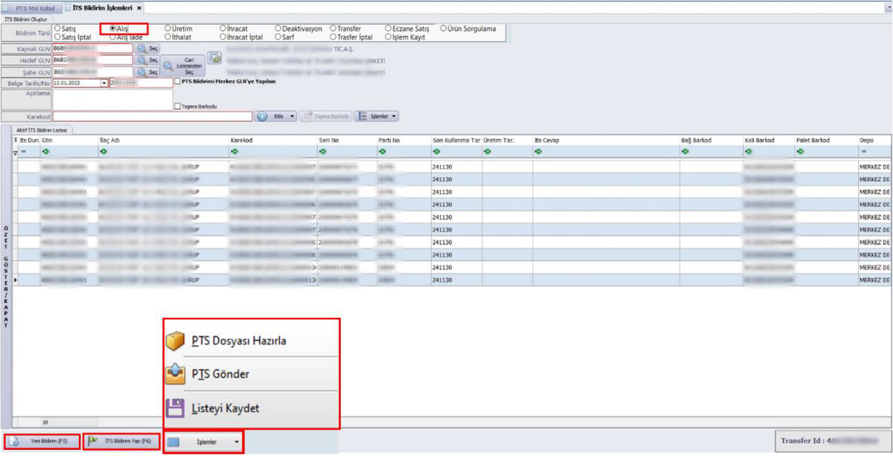 - PTS Yükleme: Karekodlar, İşlemler kısmındaki "PTS Yükle" veya "Toplu PTS Yükle" seçenekleri ile listeye eklenebilir.