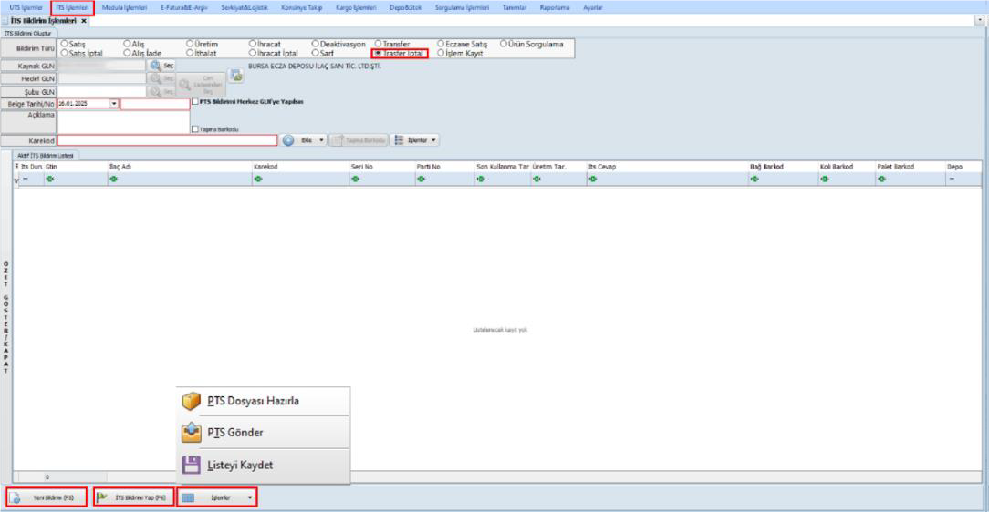 - PTS Dosyası Hazırlama: Bu işlem, transfer iptali bildirimi ile ilgili PTS dosyasının bilgisayara kaydedilmesi amacıyla gerçekleştirilir.