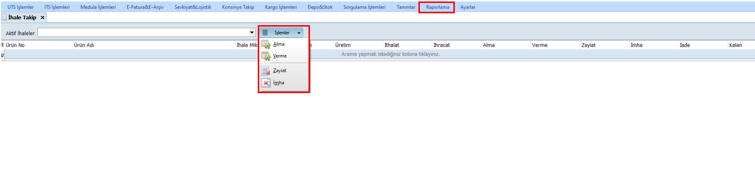 - Raporlama menüsünden 'İhale Takip' seçeneği tıklanır. Ardından, 'İşlemler' kısmından gerçekleştirilecek işlem (alma, verme, zayiat, imha) seçilir. Seçilen işlemle ilgili sayfaya yönlendirilerek işlem gerçekleştirilebilir."