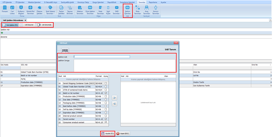 - UDI Şablon Düzenleme Ekranı- "UDI Görüntüle" Seçeneği
