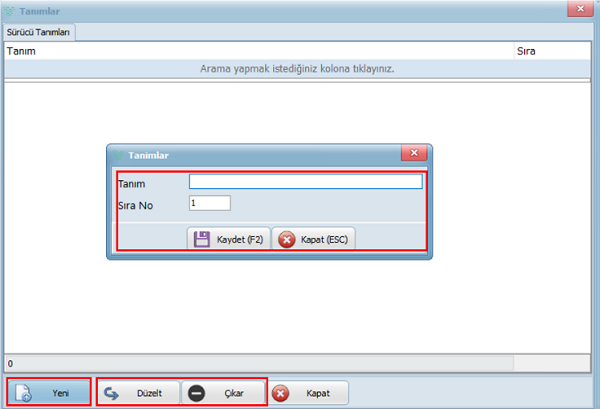 Araç tanımlama işlemi, sisteme yeni araçların kaydedilmesini sağlayarak araçların yönetimini ve takibini kolaylaştırır. Bu işlemi gerçekleştirmek için Tanımlar menüsünden Araç Tanımları seçeneği açılır. Yeni bir araç tanımı oluşturmak için Yeni butonuna tıklanır. Açılan ekranda araçla ilgili gerekli alanlar eksiksiz şekilde doldurulduktan sonra Kaydet butonuna basılarak işlem tamamlanır.