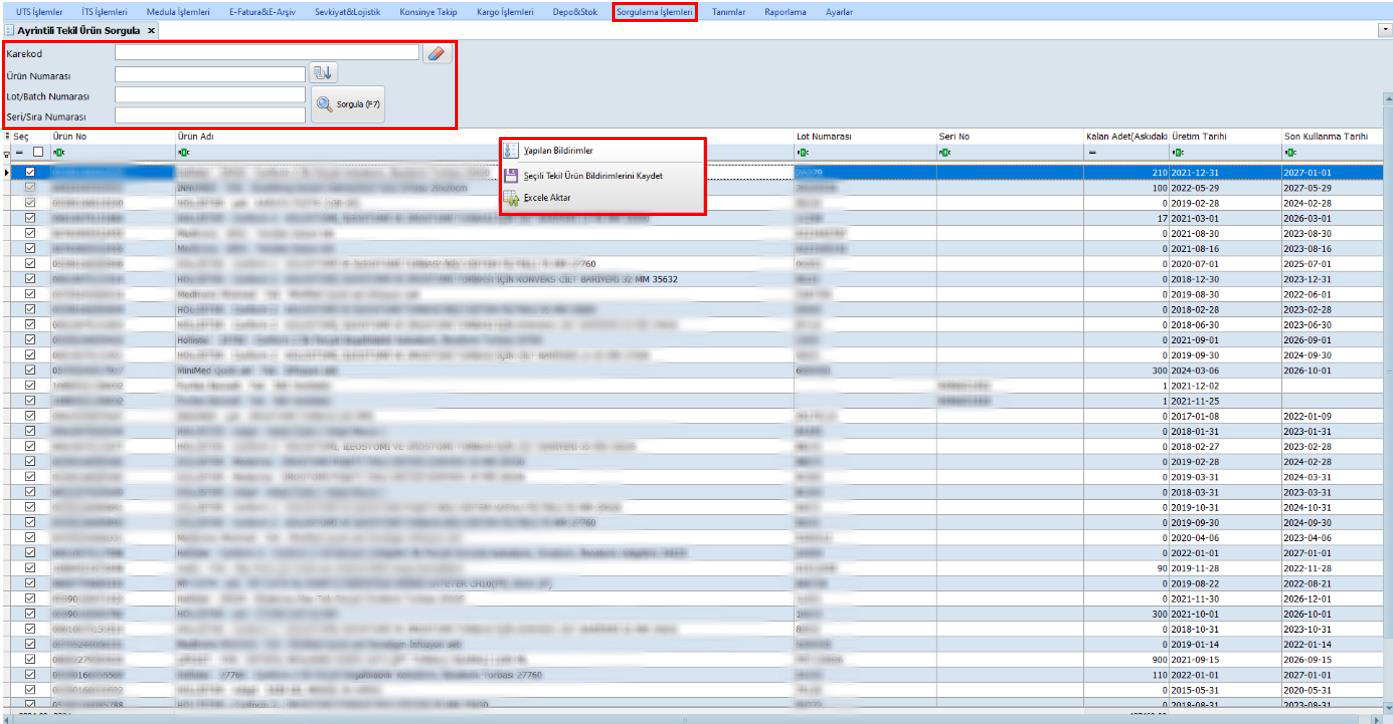 - Belirli kriterlere göre ürünlerin detaylı takibini sağlar. Barkod, karekod, ürün numarası, lot/batch veya seri/sıra numarası kullanılarak spesifik ürünlere erişilir. Stok kontrolü, üretim takibi ve geçmiş bildirimlerin incelenmesi için kullanılır. Veriler kaydedilebilir veya Excel formatında raporlanabilir.