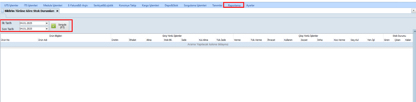 Tarih aralığı belirlendikten sonra, yalnızca seçilen döneme ait bildirim türlerine göre stok durumu görüntülenir. Bu özellik, stok takibini özelleştirerek, yalnızca ihtiyaç duyulan verilerin incelenmesine olanak tanır.