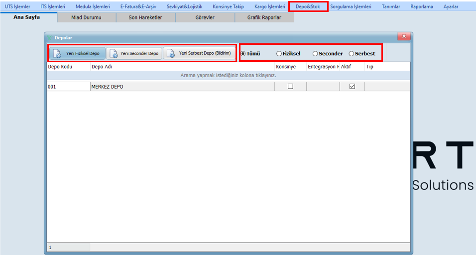 - Depo Tanımlaması Yapma: Hangi depo türünü seçeceğinize karar verdikten sonra, "Yeni Depo Ekle" butonuna tıklayarak yeni bir depo tanımlama ekranı açılacaktır.