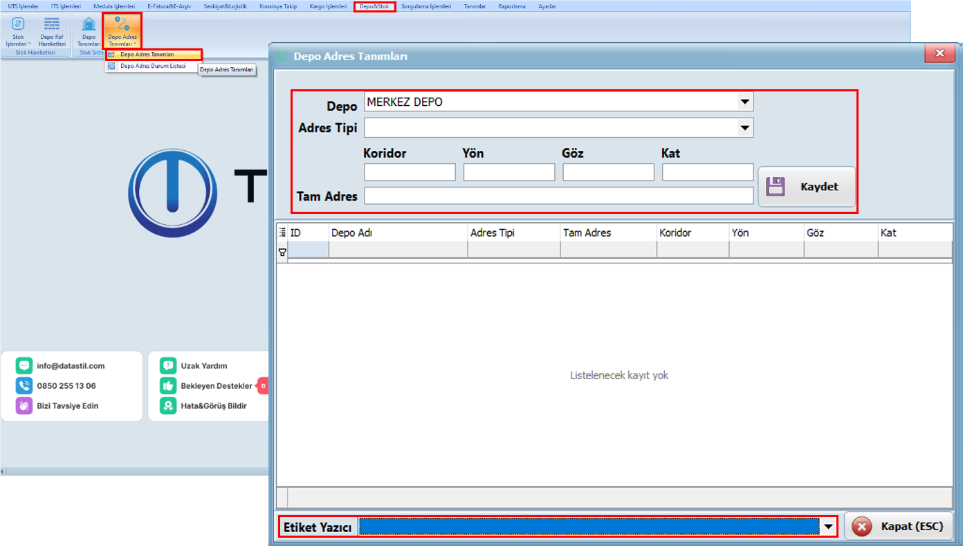 Depo adres tanımlamaları, işletmenin depo adreslerini sistem üzerinde doğru bir şekilde yönetmesine olanak tanır. Buradan, sistemde daha önce tanımlanmış olan depoların listesi seçilebilir.