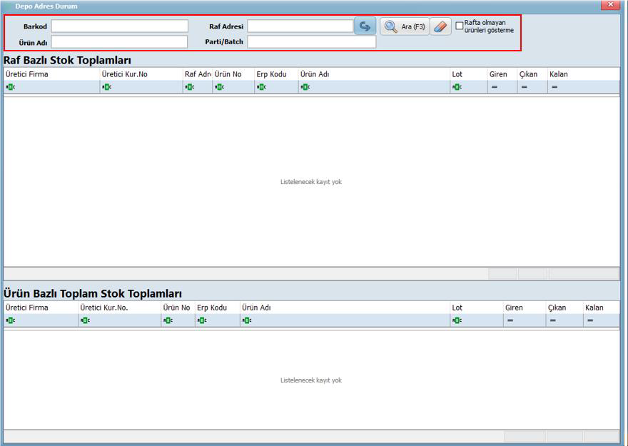 - Raf Adresi: Belirli bir rafın stok durumunu görüntülemek için, rafın adı ya da kodu bu alana yazılır. Burada, daha önce tanımlanmış olan raf adresleri kullanılabilir.