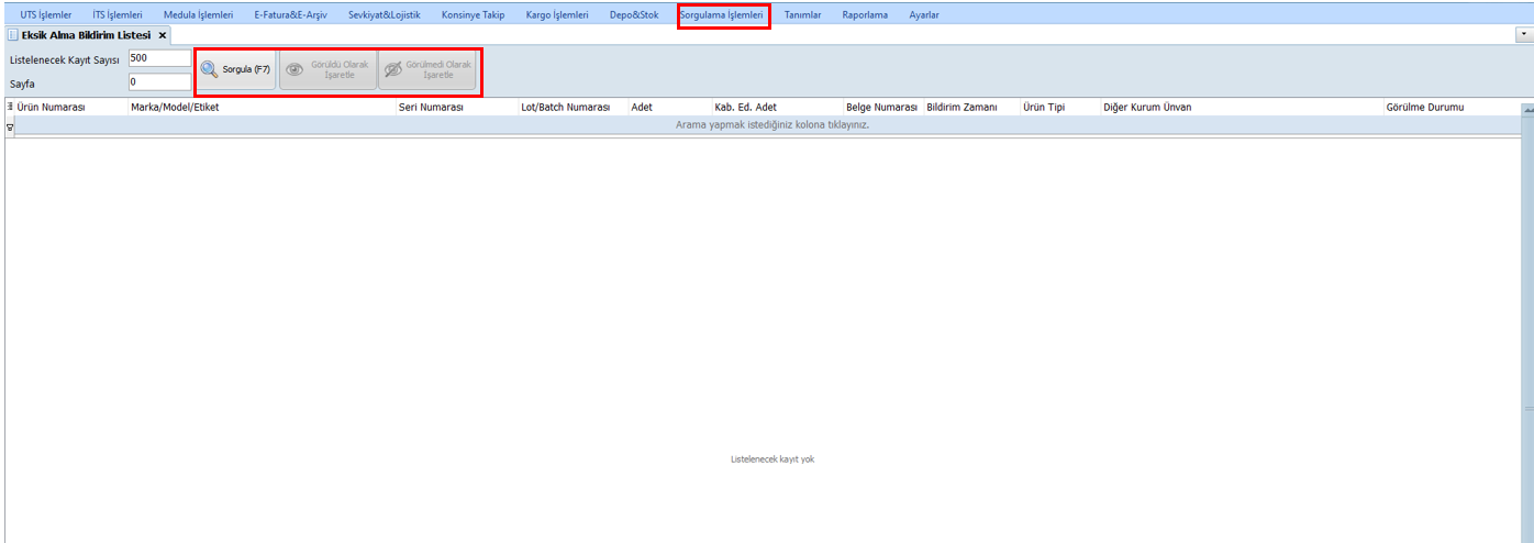 - Eksik Alma Bildirimi: Sorgulama işlemiyle eksik alma bildirimleri listelenebilir. "Görüldü" olarak işaretlendiğinde, ürünler stoklarınıza aktarılır; "Görülmedi" olarak işaretlendiğinde ise ilgili ürünler listede kalmaya devam eder.