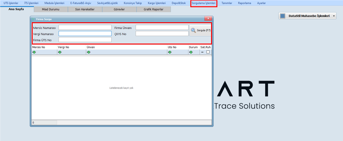 - Firma Sorgu: Bir firma hakkında bilgi edinmek amacıyla kullanılan ekran üzerinden, firmanın MERSİS numarası, vergi numarası, ÜTS numarası, firma adı veya ÇKYS numarası gibi bilgileri girerek sorgulama yapılabilir. Tüm gerekli alanlar doldurulduktan sonra "Sorgula" butonuna tıklanarak, firmaya ait tüm detaylar ekranda görüntülenir.
