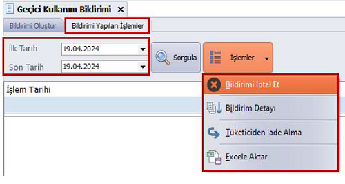 Belirli bir tarih aralığı seçilerek "Sorgula" seçeneği tıklanır. Bu işlem sonucunda, belirtilen tarihler arasında gerçekleştirilen tüm geçici kullanım bildirim işlemleri listelenir.