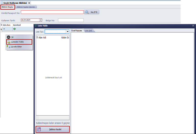 - Listeden Yükle: Daha önce hazırlanmış bir Excel dosyası varsa, "Listeden Yükle" seçeneği ile dosya yüklenir ve içeriği sisteme aktarılır.