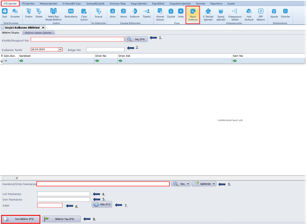 Bildirim İptali: İptal edilmek istenen bir geçici kullanım bildirimi seçilerek işlem sonlandırılabilir. Bu işlem, yalnızca gerekli yetkilere sahip kullanıcılar tarafından gerçekleştirilebilir.
