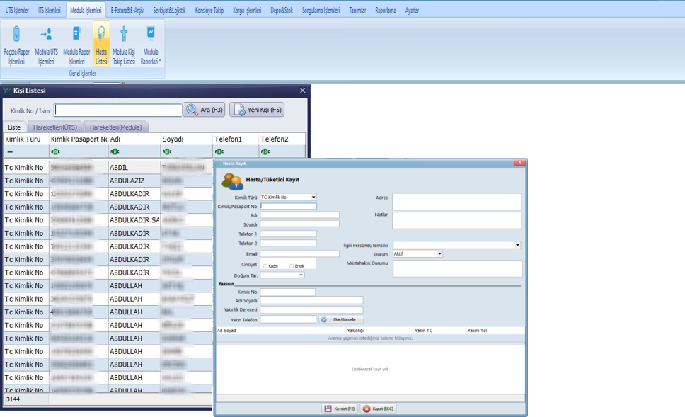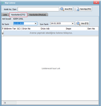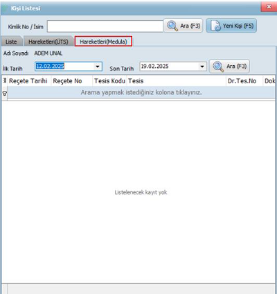 Kişi Listesi/Hareketleri (Medula): Belirtilen tarih aralığı seçilir ve "Ara" butonuna tıklanarak Medula üzerindeki hasta hareketleri görüntülenir.
