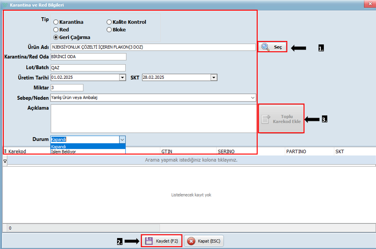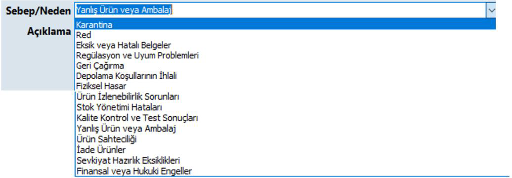 - Sebep/Neden: Açılır listeden işlem sebebi seçilir. (Yanlış Ürün veya Ambalaj, Karantina, Red, Eksik veya Hatalı Belgeler, Regülasyon ve Uyum Problemleri, Geri Çağırma, Depolama Koşullarının İhlali, Fiziksel Hasar, Ürün İzlenebilirlik Sorunları, Stok Yönetimi Hataları, Kalite Kontrol ve Test Sonuçları, Ürün Sahteciliği, İade Ürünler, Sevkiyat Hazırlık Eksiklikleri, Finansal veya Hukuki Engeller.
