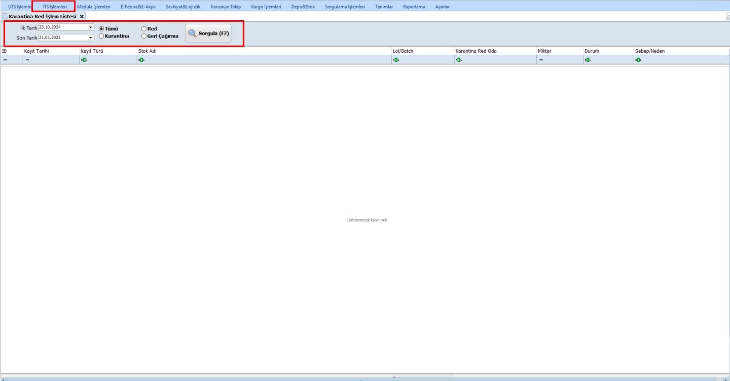 Kapsam Seçenekleri: - Tümü: Tüm karantina red işlemlerini listeler. - Red: Sadece reddedilen işlemleri listeler. - Geri Çağırma: Geri çağırılan işlemleri listeler. - Karantina: Karantinadaki kayıtları listeler.