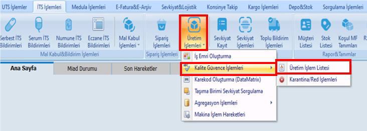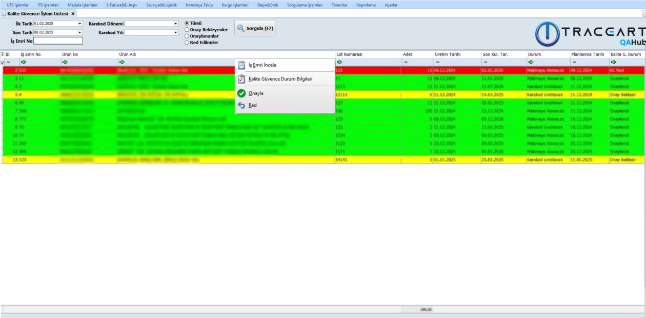 Karantina ve Red Bilgileri ekranı, ürünlerin karantinaya alınması, reddedilmesi, geri çağrılması, kalite kontrol süreçlerine tabi tutulması veya bloke edilmesi işlemlerini yönetmek için kullanılır. Bu ekran aracılığıyla, ürünlere ait lot, üretim tarihi, miktar ve ilgili durum bilgileri kaydedilir sebepler belirtilir ve izlenebilirlik sağlanır.