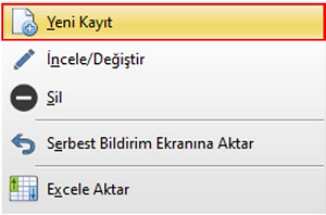 Sağ tuş menüsünden "Yeni Kayıt" seçeneği kullanılarak yeni bir kayıt oluşturulur.