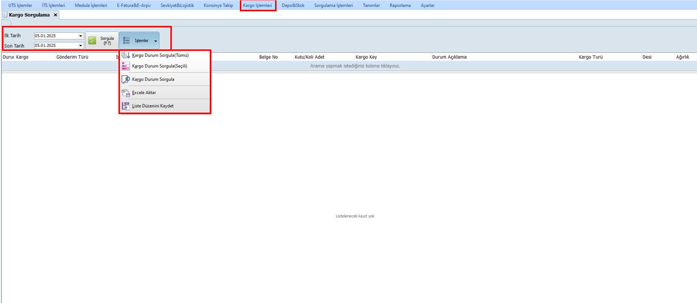- Kargo Durum Sorgula (Tümü): Seçilen tarih aralığındaki tüm kargo hareketleri getirilir.