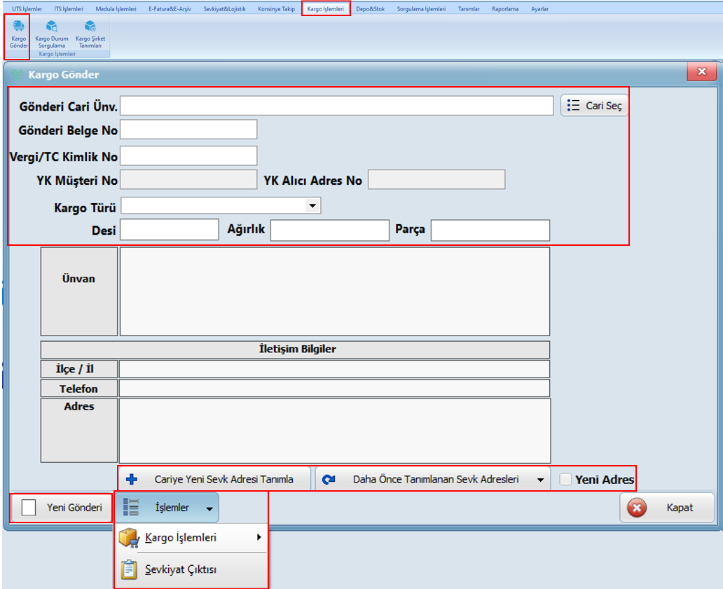 - Gönderi Cari Unvanı: Kargo gönderilecek firmanın veya kişinin adı girilir.