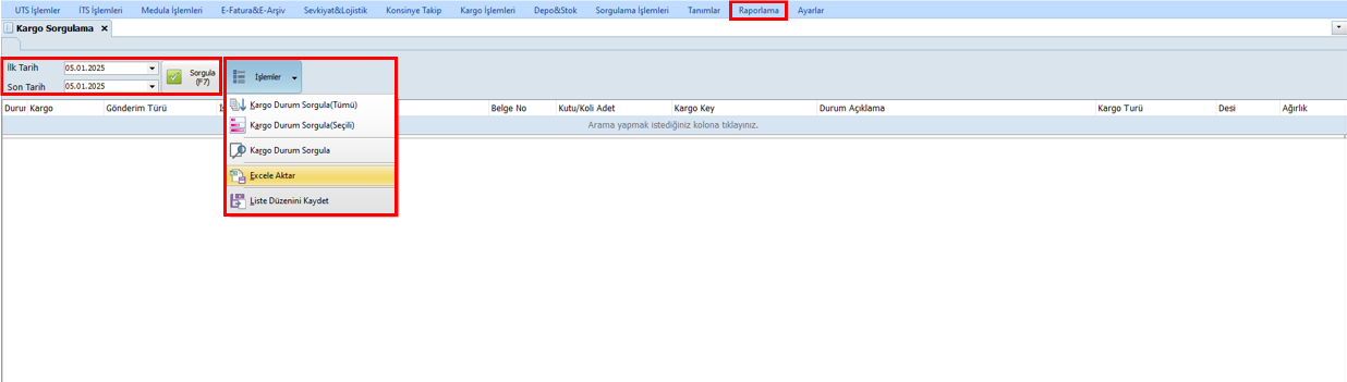 Kargo Sorgulama ; İşlemler kısmından, mevcut duruma göre önce tarih aralığı belirlenir. Daha sonra istenilen sorgulama seçeneği seçilip 'Sorgula' butonuna tıklanır.