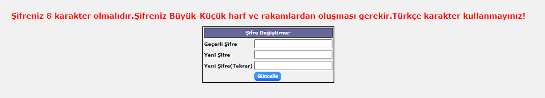 Şifre Değiştirme: "Şifre Değiştir" bölümü kullanılarak şifre değiştirilebilir. Çıkış Yap: Sistemden güvenli şekilde çıkış yapmayı sağlar.