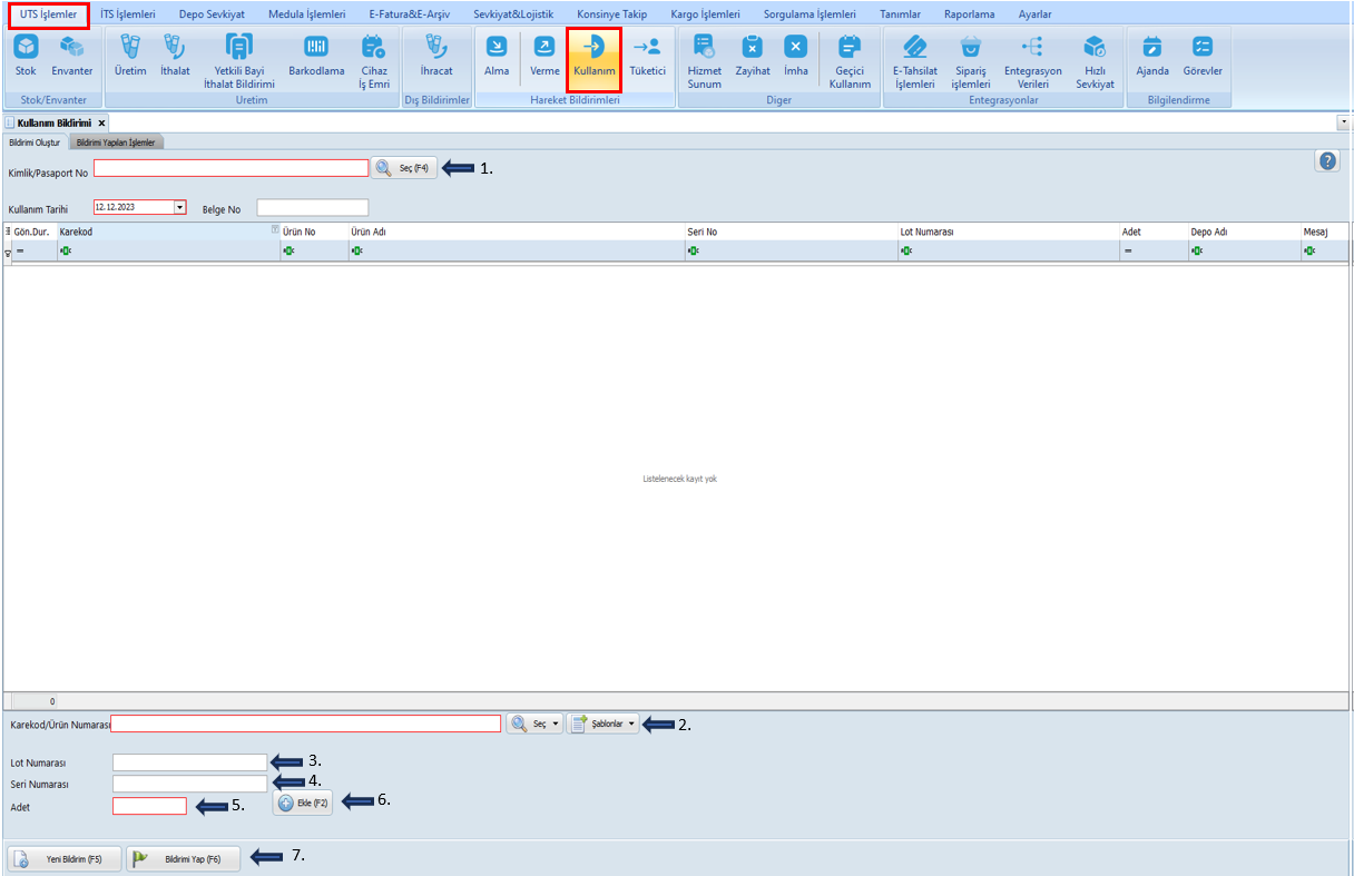 Bildirim İptali: İptal edilmek istenen bir kullanım bildirimi seçilerek işlem sonlandırılır. Bu işlem, yalnızca gerekli yetkilere sahip kullanıcılar tarafından gerçekleştirilebilir.