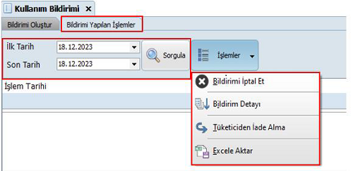 Tarih Aralığı Belirleyerek Sorgulama: Belirli bir tarih aralığı girilerek "Sorgula" seçeneği tıklanır. Bu işlem sonucunda, seçilen tarih aralığında gerçekleştirilen tüm kullanım bildirim işlemleri listelenir.