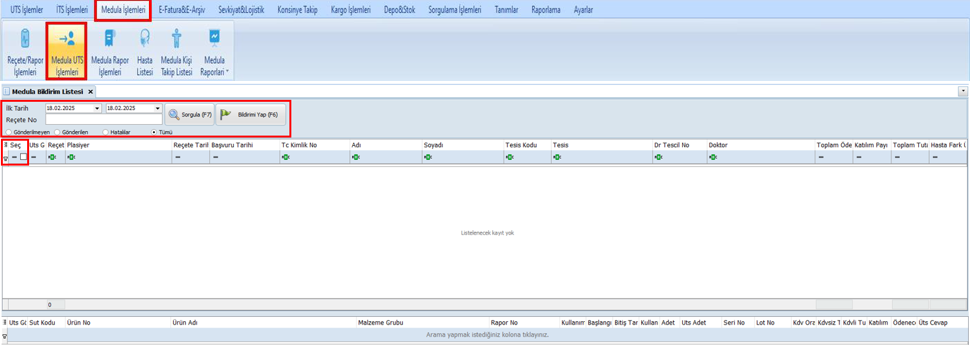 Ürün Takip Sistemi (ÜTS) kapsamında reçete edilen tıbbi malzemelerin Medula üzerinden sorgulanması ve Sağlık Bakanlığı’na bildirilmesi için kullanılır. Kullanıcı, Tarih aralığını seçerek reçeteleri görüntüler, Lot Numarasını kontrol eder ve bildirim işlemini tamamlar.