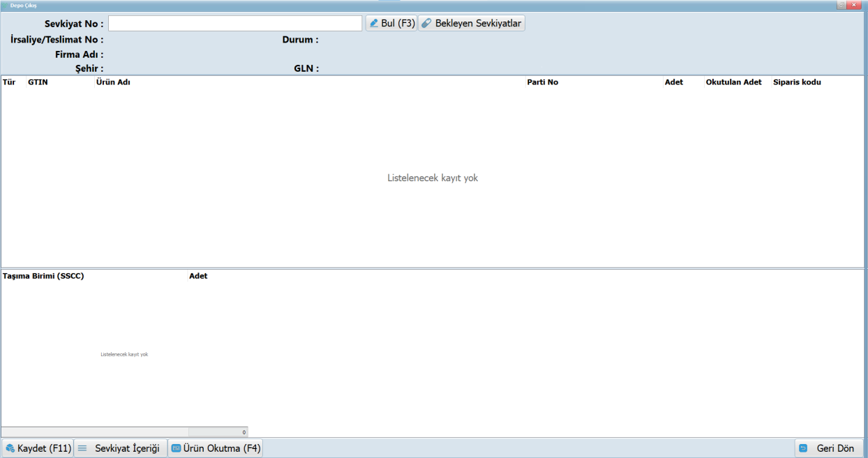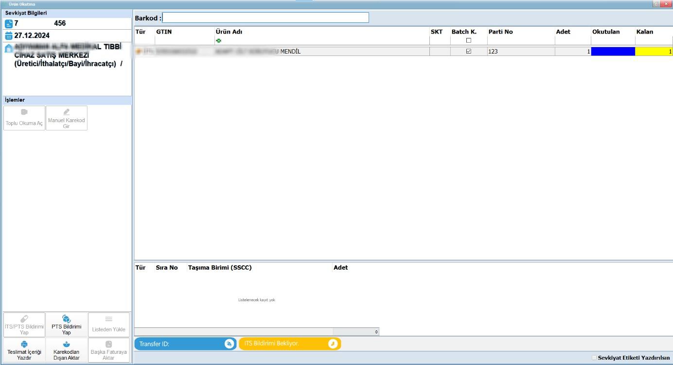 - Ekranın alt kısmındaki Taşıma Birimi (SSCC) alanı, sevkiyatta kullanılan kutu veya palet numarasını ifade eder.