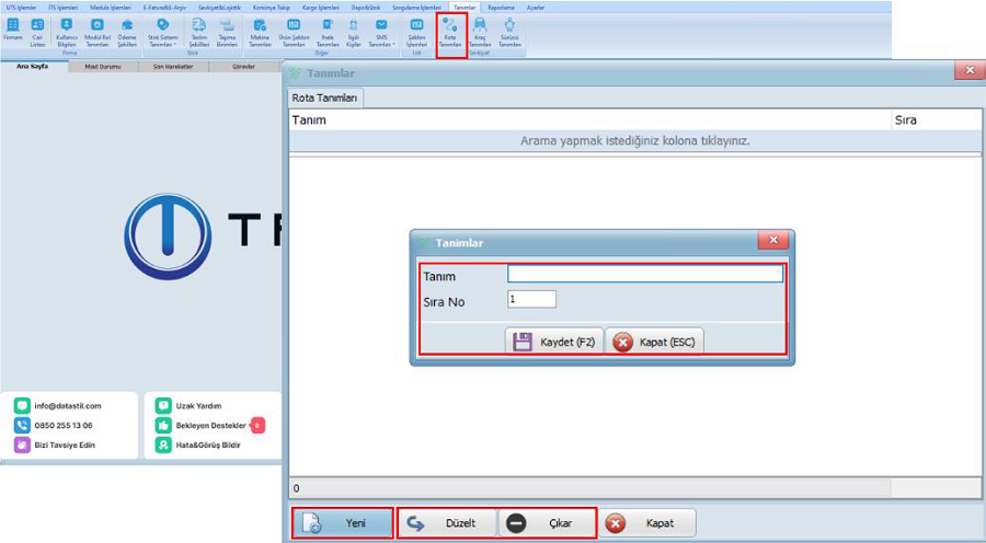 Rota tanımları, Yeni bir rota oluştururken rota adı, güzergâh bilgileri ve diğer ilgili detaylar eksiksiz şekilde doldurulmalıdır. Kaydetme işlemi tamamlandığında, tanımlanan rota sistemde kayıt altına alınır ve kullanılabilir hale gelir. Tanımlar menüsünden Rota Tanımları seçeneği açılır. Yeni bir rota oluşturmak için Yeni seçeneğine tıklanır. Açılan ekranda gerekli alanlar doldurulduktan sonra Kaydet butonuna basılarak işlem tamamlanır