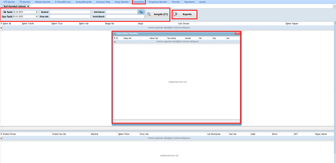 Depo ve Stok Menüsünden Raf Hareket Listesi Sorgulama ve Raporlama: