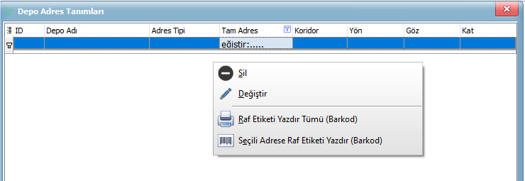 Sağ Tıklama Seçenekleri: Raf adresi üzerine sağ tıkladığınızda aşağıdaki seçenekler görüntülenir: