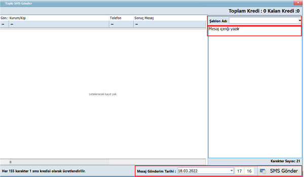 Toplu SMS Gönderimi Önceden oluşturduğumuz SMS şablonu seçilir, ardından mesaj içeriği yazılır. Mesaj gönderim tarihi belirlenir. Son olarak, 'SMS Gönder' butonuna tıklanarak işlem tamamlanır.