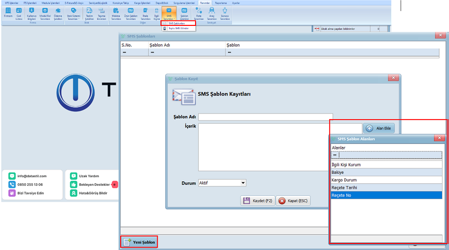 Tanımlar menüsünden 'SMS Tanımları' seçeneği açılır. Yeni bir SMS şablonu oluşturmak için 'Yeni Şablon' seçeneğine tıklanır. Karşımıza Şablon Kayıt ekranı gelir. 'Şablon Adı' kısmına şablon adı yazılır, 'İçerik' kısmına metin eklenir veya ilgili kişi, kurum, bakiye, kargo durumu, reçete tarihi ve reçete numarası eklenebilir. 'Durum' kısmı seçildikten sonra 'Kaydet' butonuna basılır.