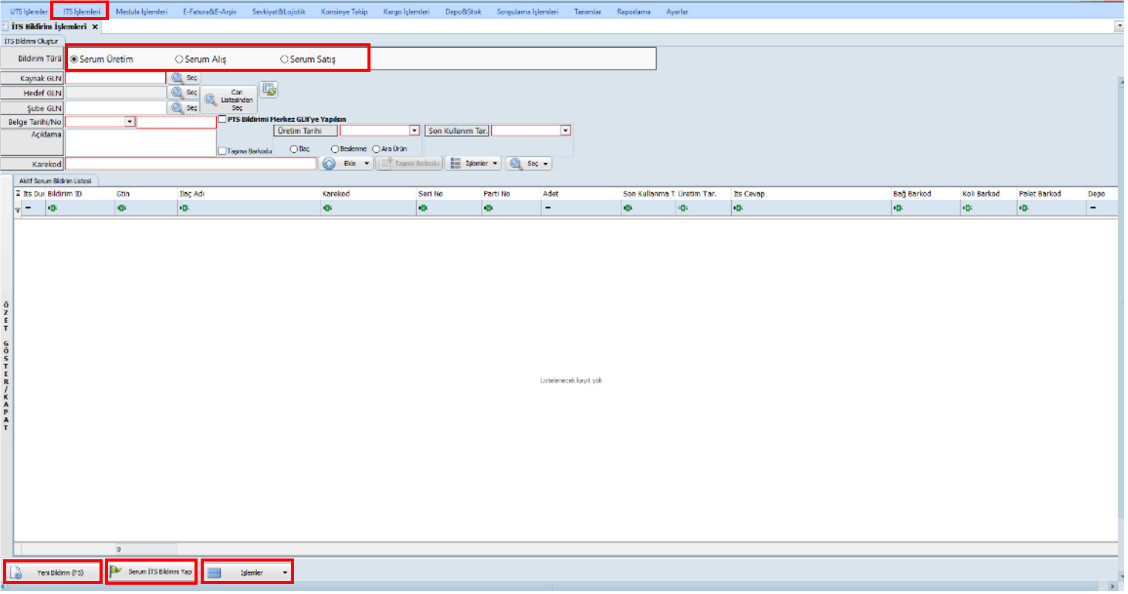 Serum İTS işlemleri, serum ile ilgili üretim, alış ve satış işlemlerini takip etmek ve bildirmek amacıyla gerçekleştirilir.