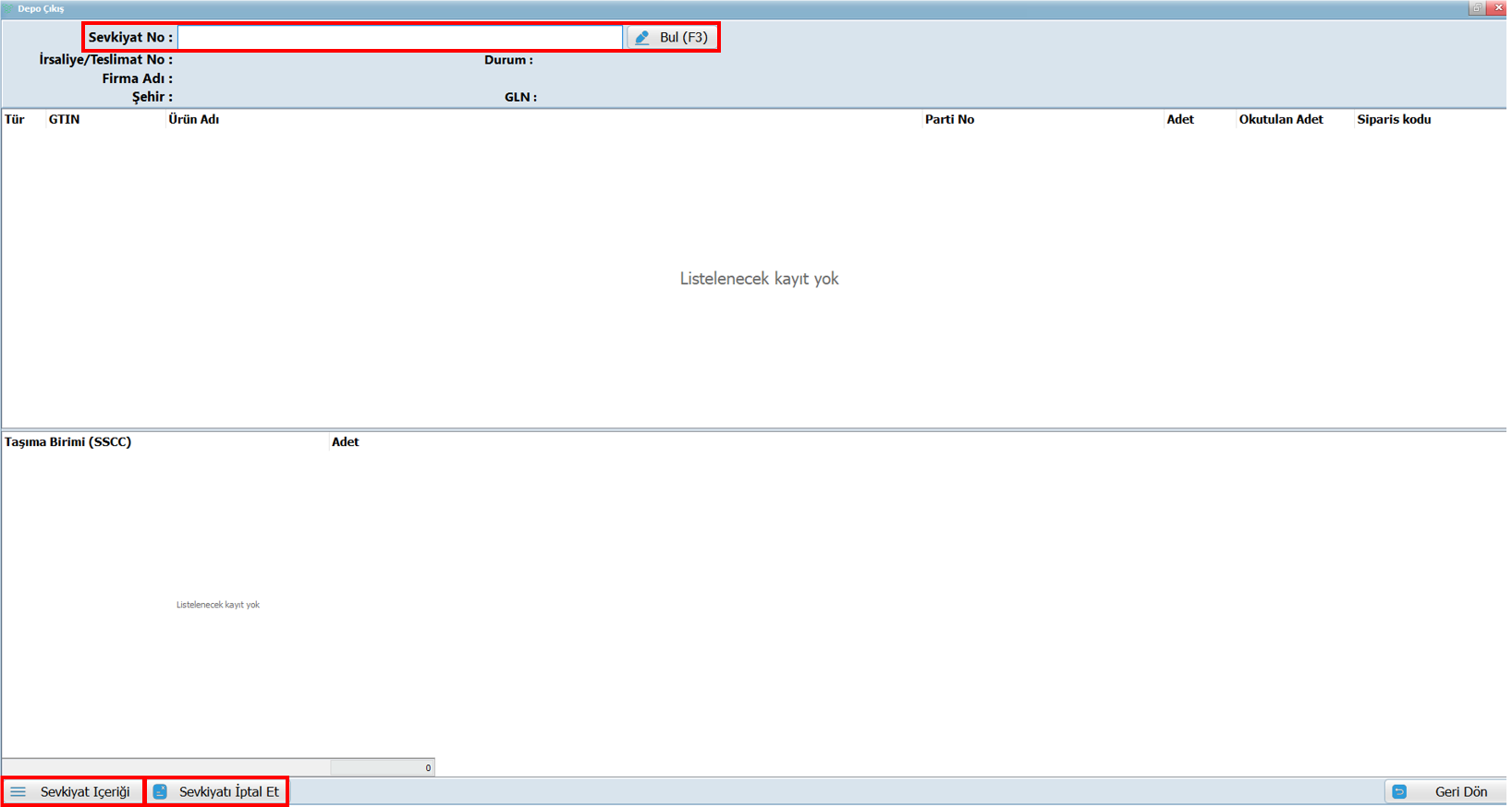 - Sevkiyat işlemini iptal etmek için öncelikle ilgili Sevkiyat Numarası girilir.