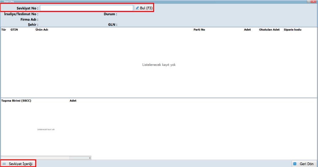 Sevkiyat Numarası veya Belge Numarası Girilir: Sevkiyat bilgilerini sorgulamak için ilgili Sevkiyat No veya İrsaliye/Teslimat No alanına gerekli numara girilir.