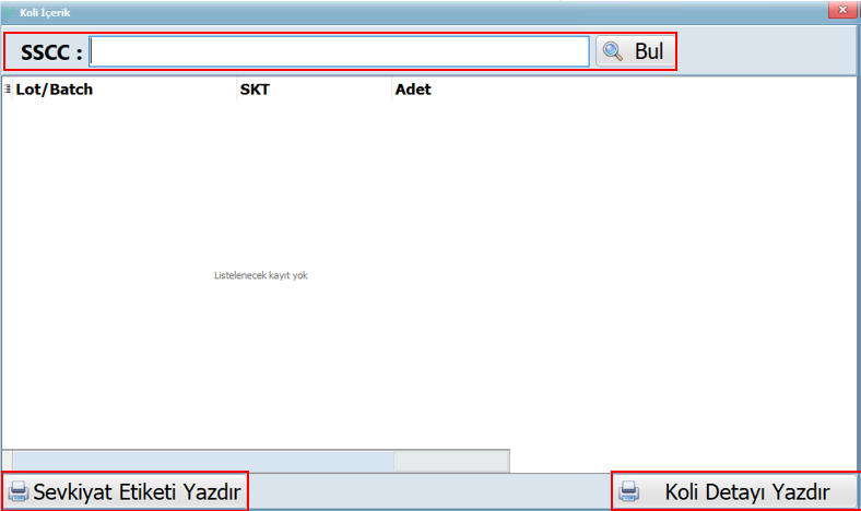 - Sevkiyat Etiketi Yazdır: Koliye ait sevkiyat etiketini yazdırmak için kullanılır.