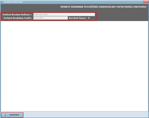 Belirli karekodları serbest bırakmak için kullanılır. Kullanıcı, serbest bırakılacak karekodları bu alana yapıştırarak veya okutarak işlem gerçekleştirebilir. Serbest Bırakan Kullanıcı: İşlemi gerçekleştiren kullanıcı bilgisi otomatik olarak görüntülenir.