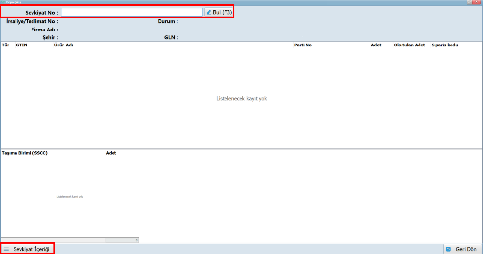 Taşıma Birimi Sorgula SSCC (Serial Shipping Container Code): Taşıma biriminin benzersiz barkod numarasıdır. Bu kod, sevkiyat sürecinde kolinin içeriğini ve özelliklerini takip etmek için kullanılır.