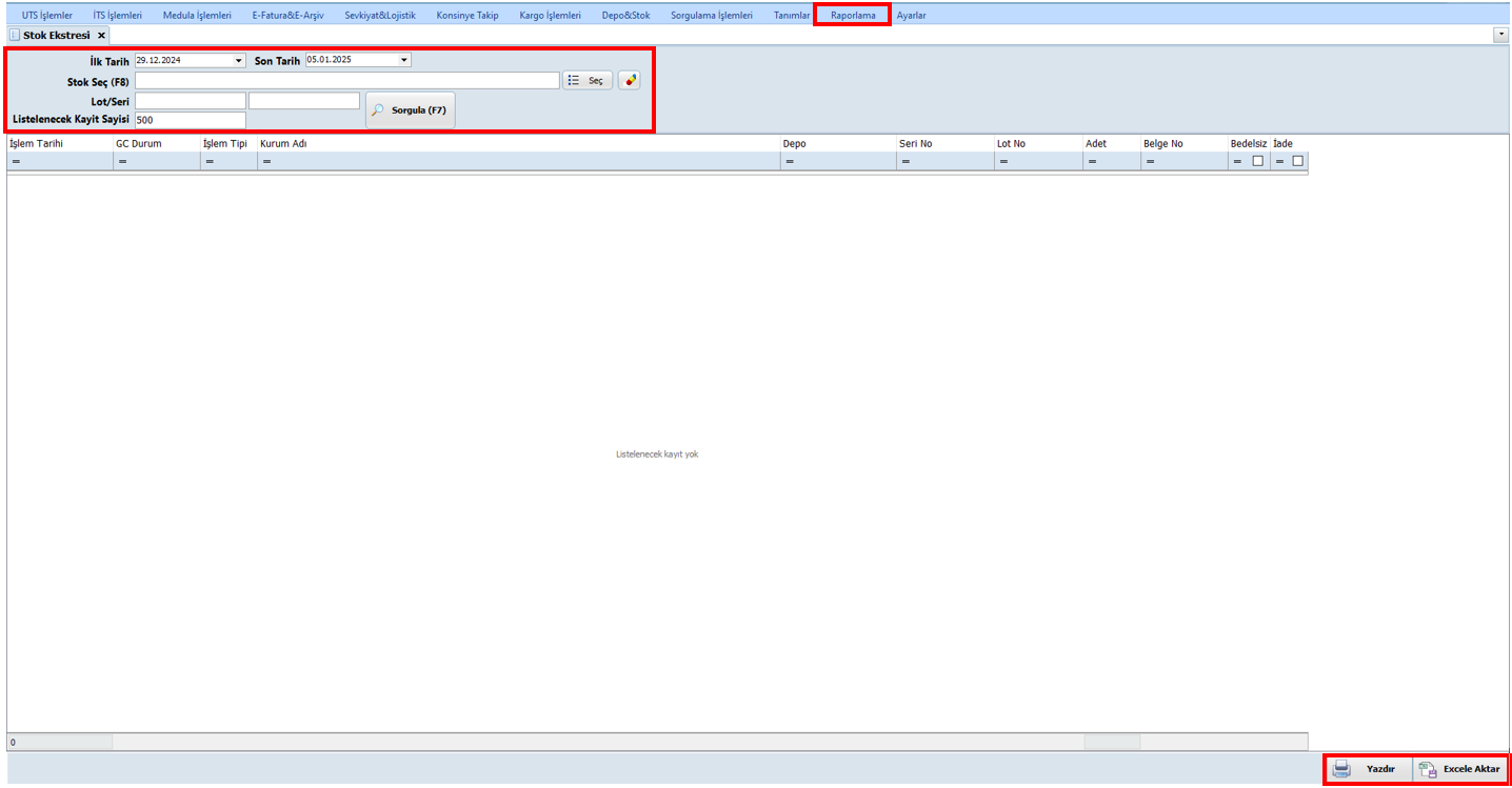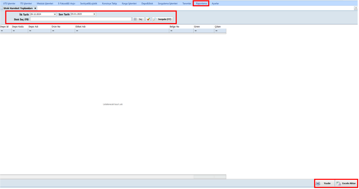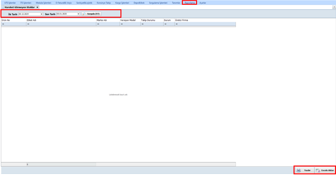 Belirli bir tarih aralığı girerek, hareket görmeyen stoklar sorgulanabilir.